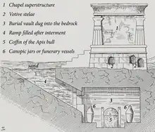 The Serapeum of Saqqara was the ancient Egyptian burial place for sacred bulls of the Apis cult at Memphis. It was believed that the bulls were incarnations of the god Ptah, which would become immortal after death as Osiris-Apis. a name which evolved to Serapis (Σέραπις) in the Hellenistic period, and Userhapi (ⲟⲩⲥⲉⲣϩⲁⲡⲓ) in Coptic. It is part of the Saqqara necropolis, which includes several other animal catacombs, notably the burial vaults of the mother cows of the Apis.[1]