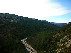 View of the wooded northern slopes of the range and the Cervol River