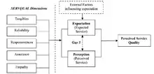 A customer's expectation of a particular service is determined by factors such as recommendations, personal needs and past experiences. The expected service and the perceived service sometimes may not be equal, thus leaving a gap. The service quality model or the ‘GAP model’ developed in 1985, highlights the main requirements for delivering high service quality. It identifies five ‘gaps’ that cause unsuccessful delivery. Customers generally have a tendency to compare the service they 'experience' with the service they 'expect'. If the experience does not match the expectation, there arises a gap.[11] Given the emphasis on expectations, this approach to measuring service quality is known as the expectancy-disconfirmation paradigm and is the dominant model in the consumer behaviour and marketing literature.[12]