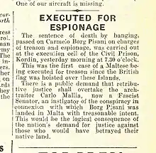On 18 May 1942, Maltese irredentist and SIM spy Carmelo Borg Pisani was sent on an espionage mission to Malta, to check British defences and help prepare for the planned Axis invasion of the island (Operazione C3).[37] Borg Pisani was recognized by one of his childhood friends, Cpt. Tom Warrington, who denounced him. British Intelligence kept him under arrest in a house in Sliema till August. He was then transferred to Corradino prison, accused of treason. On 12 November 1942, he stood trial under closed doors in front of three judges, headed by Chief Justice of Malta Sir George Borg, and defended by two lawyers.[38] His plea that he had renounced British citizenship by returning his passport and acquisition of Italian citizenship (which would have granted him the status of prisoner of war) was not upheld by the military court. On 19 November 1942, he was publicly sentenced to death for espionage, for taking up arms against the Government and forming part of a conspiracy to overthrow the government.[39] His execution by hanging took place at 7:30AM on Saturday, 28 November 1942.[39] Borg Pisani was posthumously awarded the Gold Medal of Military Valor, the highest Italian military award, by King Victor Emmanuel III a few days after his death.[40]