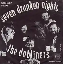 The song passed from oral tradition to a global mass market with The Dubliners recording of "Seven Drunken Nights". The record reached number 7 in the UK charts in 1967 and appeared on Top of the Pops, thanks to its diffusion on Radio Caroline. Although it was banned from the Irish national broadcasting station, the song also charted at No.1 in Ireland.[3]