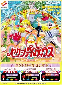 Sexy Parodius[lower-alpha 1] is a 1996 horizontal-scrolling shooter arcade game developed by Konami.[4] It is the fifth installment of the Parodius series. Like the rest of the series, it is a parody of the Gradius series and other Konami games. It also contains sexual level and enemy designs, as well as risqué innuendo. Many level bosses are women in various erotic costumes (such as the "bunny costume" modeled on Playboy Bunnies) or various states of undress.