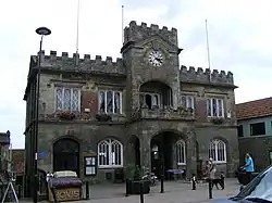 The current building, which was commissioned by Earl Grosvenor, was designed in the Neoclassical style and built between 1826[5] and 1837.[1] It was constructed in ashlar stone and was castellated.[1] The design involved a symmetrical main frontage with five bays facing onto the High Street; the central bay featured a porch on the ground floor and a casement window on the first floor with a clock tower being added in 1879[6] (initially built in wood, it was rebuilt in stone in 1925).[7] The clock is by Gillett & Bland and strikes the hours on a single bell.[7] The basement contained a number of police cells which could be accessed from the rear of the building.[8] The principal room in the building was the council chamber on the first floor which was panelled and, on the south side, featured views out over Gold Hill,[9][10] which has been described as "one of the most romantic sights in England."[11]