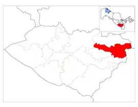 Shahrisabz District (Uzbek: Shahrisabz tumani) is a district of Qashqadaryo Region in Uzbekistan. The capital lies at the city Shahrisabz, itself not part of the district.[1] It has an area of 1,620 km2 (630 sq mi)[2] and its population is 223,800 (2021 est.).[3] The district consists of 13 urban-type settlements (Miroqi, Qumqishloq, Oʻrtaqoʻrgʻon, Chorshanbe, Temirchi, Yangiqishloq, Qutchi, Shamaton, Ammogʻon-1, Qoʻshqanot, Anday, Xoʻjaxuroson, Keldihayot) and 12 rural communities.[1]