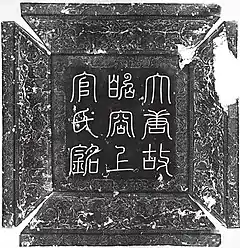 In September 2013 it was announced that archeologists in China had discovered the tomb of Shangguan Wan'er near the airport at Xianyang, Shaanxi province. The tomb was badly damaged, perhaps deliberately according to Chinese archeologists, and only a very few burial goods were discovered inside, including some sculptures of people riding horses. The identity of the tomb's occupant was determined from an epitaph discovered in the tomb, which was inscribed "Epitaph of the late imperial consort (Zhaorong) Madam Shangguan of the Great Tang dynasty" (大唐故昭容上官氏銘) on its lid.[15] From the epitaph it was written that Princess Taiping (Wu Zetian's daughter) arranged Shangguan's burial and gave her a proper funeral. That shows Princess Taiping was having good relationship with Shangguan. At the end of the epitaph, we can see how was her death described: "The mountain of muse collapsed, the River Xiao Xiang discontinued, a pearl concealed, a jade broken asunder."[16]