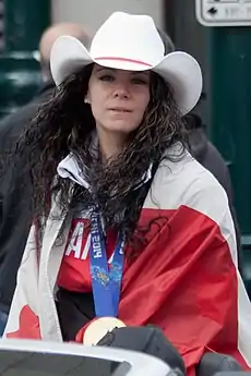 She was a member of the 2009–10 Hockey Canada national women's team which won the gold medal at the 2010 Winter Olympics and earned two shutouts, including the final game against the United States women's national ice hockey team.[16] She was selected to the tournament all-star team at the Olympics, and was named top goaltender.[17] In a March 31, 2012, exhibition game versus the United States, Szabados made 24 saves in a 1–0 shutout win at the Ottawa Civic Centre.[18]