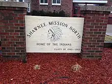 After a banner for Shawnee Mission North was removed from the Lawrence High School gym at the request of the LHS Inter-Tribal Club in 2017,[9] the Shawnee Mission school district responded that the school has had the permission of the Eastern Shawnee Tribe of Oklahoma since 1992 and had no plans to review the use of their mascot.[10] Upon being told about the LHS action, the current Chief of the Eastern Shawnee Tribe stated that she appreciates that Shawnee Mission North showed respect in 1992, however the use of images of Plains Indians rather than Woodland Indians is inaccurate and the use of the "tomahawk chop" by fans at games is inappropriate.[11] The Eastern Shawnee Tribe of Oklahoma's business council on March 10, 2017 approved a resolution formally rescinding the permission granted in 1992 for the use of the Indian as a mascot.[12] The school district superintendent responded that there would be conversations concerning the mascot.[13] In 2020, there was a renewed push to replace the mascot before the school's centennial in 2022.[14] The Shawnee Mission USD 512 voted unanimously in January 2021 in favor of a policy that school mascots be culturally and racially sensitive and appropriate. In addition to Shawnee Mission North, three elementary schools will change their mascots.[15]