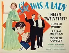 She Was a Lady is a 1934 American drama film directed by Hamilton MacFadden and written by Gertrude Purcell. It is based on the 1934 novel She Was a Lady by Elisabeth Cobb. The film stars Helen Twelvetrees, Donald Woods, Ralph Morgan, Monroe Owsley, Irving Pichel and Doris Lloyd. The film was released on August 22, 1934, by Fox Film Corporation.[1][2][3]