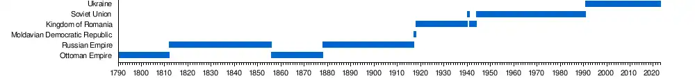 In 1776, next to the estate of the general of the Ottoman army, Kara Mahmet (Ottoman Turkish: Kara Mehmet), on the bank of the Techia stream, the first Ukrainian settlement appeared, founded by Cossack families from Zaporozhian Sich. 23 April [O.S. 12 April] 1790, the settlement was transformed into sloboda. In 1812, following the Treaty of Bucharest, became part the Bessarabian Oblast of the Russian Empire. In 1856, according to the results of the Treaty of Paris, village became part of states under Ottoman Empire suzerainty: Principality of Moldavia (1856–1859), United Principalities of Moldavia and Wallachia (1859–1862), Romanian United Principalities (1862–1866), Principality of Romania (1866–1878). Sloboda became a village and labor obligations and taxes were introduced for the inhabitants. In 1878, according to the Treaty of Berlin, the village returned to the Bessarabia Governorate of the Russian Empire, and the Principality of Romania gained its independence. In 1917, after the collapse of the Russian Empire, the village became part of the self-proclaimed Moldavian Democratic Republic, formed in the former Bessarabia Governorate. In 1918, the Kingdom of Romania introduced romanian troops into the Bessarabia Governorate (including the village) and the decision was made to join Bessarabia to the Kingdom of Romania. In 1940, according to the Molotov–Ribbentrop Pact, the Soviet Union annexed Bessarabia to the USSR, and the village belonged to the Ukrainian SSR. 1941, after the start of Operation Barbarossa by the fascists, the village is under the occupation of the Kingdom of Romania. In 1944, during the second Jassy–Kishinev offensive, the Soviet Army liberated the village from the fascists, and in 14 November 1945 it was renamed Shevchenkove.[2] In 1991, after the dissolution of the Soviet Union, the village became part of Ukraine.