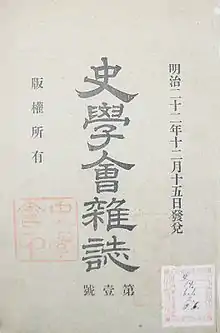 The Historical Society of Japan was founded on November 1, 1889, and began publishing a historical journal entitled Shigakkai zasshi (Journal of the Historical Society) on December 15 of that same year. In 1892 the name of the journal was changed to Shigaku zasshi. Two professors of history at Tokyo Imperial University, Shigeno Yasutsugu and Ludwig Rieß were instrumental in founding the society and beginning publication of the journal. Ludwig Rieß consciously modeled the journal on contemporary European historical journals such as the Historische Zeitschrift in Germany, the Revue Historique in France, and the English Historical Review in England.