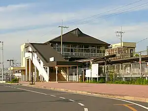 This station has an elevated station building with two opposed ground-level side platforms underneath, serving three tracks. The station is staffed.