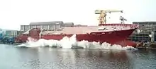 Ships are typically larger than boats, but there is no universally accepted distinction between the two. Ships generally can remain at sea for longer periods of time than boats.[3] A legal definition of ship from Indian case law is a vessel that carries goods by sea.[4] A common notion is that a ship can carry a boat, but not vice versa.[5] A ship is likely to have a full-time crew assigned.[6] A US Navy rule of thumb is that ships heel towards the outside of a sharp turn, whereas boats heel towards the inside[7] because of the relative location of the center of mass versus the center of buoyancy.[8][9] American and British 19th century maritime law distinguished "vessels" from other watercraft; ships and boats fall in one legal category, whereas open boats and rafts are not considered vessels.[10]