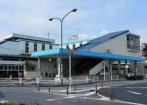 This station has an elevated station building with one ground-level island platform and one ground-level side platform underneath, serving three tracks. The station is staffed.