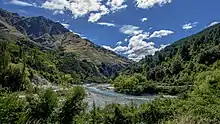 The Shotover River (Māori: Kimiākau) is located in the Otago region of the South Island of New Zealand.[1] The name correctly suggests that this 75-kilometre (47 mi) long river is fast flowing, with numerous rapids. The river flows generally south from the Southern Alps on its journey running through the Skippers Canyon, draining the area between the Richardson Mountains and the Harris Mountains, before flowing into the Kawarau River east of Queenstown.