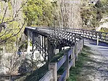 The old lower Shotover bridge was built in 1915 and replaced the previous bridge. It, in turn was replaced in 1975 by a new bridge and was used after then as a support for a pipeline. In 2004, the bridge was restored and now forms part of the Queenstown trail.[6] The bridge is 172.5 metres long and built with tall concrete piers.[7]