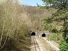 The line had originally been double track from Shrewsbury to Ludlow, and the remainder single. The latter part of the line was doubled in 1893. The tunnel at Dinmore had been constructed as a single bore, and a second bore was driven to enable the doubling.[17][18]