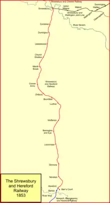 The Shrewsbury and Hereford Railway was an English railway company that built a standard gauge line between those places. It opened its main line in 1853.