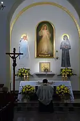 On April 23, 2017 the church was elevated to the status of a shrine (sanktuarium). The motive was its relation to St. Faustina; the church was renamed to "church of Divine Mercy and St. Faustina" accordingly.[106] In practical terms, the change included the church on the list of targets of religious tourism, fairly popular in Poland, and reinforced already growing stream of pilgrims pursuing the itinerary of St. Faustina. The building itself is no longer subject to construction works; its architecture is described as somewhat modelled on early Christian temples, with interior shaped by vaults and arches.[107] The shrine is now home to 6 religious, apart from the parish priest also 3 vicars and 2 residents;[108] they maintain a parish web page, a Facebook account[109] and issue a weekly bulletin Miłosierdzie. Overall religiosity level in the parish is far below the Polish and significantly below the Warsaw standards; while the country average for dominicantes is at 45% and the Warsaw figure is 27%,[110] at Żytnia it stands at mere 16%.[111]