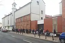 Rev. Polak launched two specific initiatives which stand out as peculiarity of the Divine Mercy and St. Faustina parish;[99] one is the 24/7 perpetual Eucharistic adoration, practiced since the burglary suffered in 2000,[100] and a popular feast Żytnią do nieba, organized early September since 2005.[101] Polak was re-assigned to another post in 2011; none of the sources consulted provides any information on motives of his departure. He was replaced as the parish priest by rev. Krzysztof Stosur, who for some time kept adding final touches to the new church interior.[102] He continued most of the parochial activities developed by his predecessors and common to most Roman-Catholic parishes in Poland, like Rosary Circle or youth altar service. Charity work is continuing, though with some change. The canteen at the corner of Leszno and Okopowa has been closed and most services performed in the premises have been formally transferred to Caritas, the religious charity organization; however, queues of the homeless and destitute city dwellers are still trademark of the church neighborhood.[103]