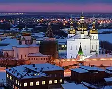 The issue of the relationships between Eastern and Ukrainian Baroque and Siberian Baroque of the 18th century was also researched in the Soviet times.[1] Some found a "Buryat decor" in Irkutsk churches, and if judging their size and construction, they were built by architects of the Northern Russian cities Totma and Veliky Ustyug.[10] According to T. S. Proskuryakova, early Siberian church architecture divides between two "subregional types": Western Siberian (Tobolsk, Tyumen, the area behind the Ural mountains) and Eastern Siberian (Irkutsk).[11] H. Yu. Kaptikov also uses that sorting system. He sees in Siberian architecture of the 18th century one of the provincial schools in Russian Baroque, along with Totma-Ustyug, Vyatsk and Uralian.[3]