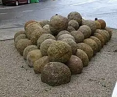 Trenches continued to be built around the city until they surrounded the entire perimeter by March 1343. Behind the trenches were earthen banks, and on these wooden walls were erected to protect the besieging soldiers, with strong towers erected at intervals.[21] Trebuchets in the Castilian camp hurled large numbers of stone balls, or bolaños.[30] The trebuchets had a maximum range of 300 metres (980 ft), and were vulnerable to parties of besiegers that were able to cross the trenches.[35] So many bolaños were launched during the siege that in 1487 King Ferdinand II of Aragon sent an expedition to the ruins of Algeciras to retrieve them so they could be used again in the siege of Málaga.[36][37][30]