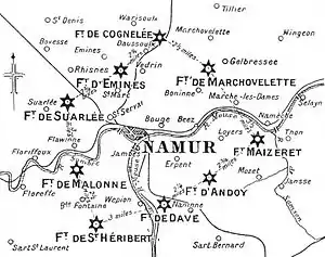 Namur was garrisoned by about 37,000 fortress troops and infantry of the Belgian 4th Division under the command of General Augustin Michel. The Belgians intended to hold the Fortified Position of Namur until relieved by the French Fifth Army.[12] Belgian and German cavalry skirmished to the north of Namur on 5 August and to the south-east two days later. On 19 August the Belgian 8th Brigade at Huy, blew the bridge over the Meuse and retired to Namur, as the German Guard Reserve Corps and XI Corps appeared from the east.[13]