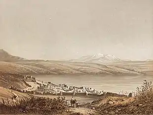 Tiberias, with its wall fortifications, and the western shores Lake Tiberias, 1857