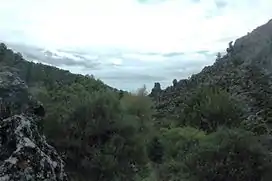 This mountain range includes the deep valleys of the Darro and the Fardes, as well as cliffs, caves, narrow ravines and springs. The mountains are covered in Mediterranean vegetation, with shrubland alternating with holm oak.[4] The range includes part of the municipal term of Huétor Santillán.[5]