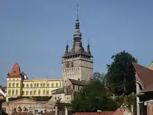 In every fortification system there is one fortress that dominates the others: the master-tower. The Clock Tower of Sighișoara (Romanian: Turnul cu Ceas, German: Der Stundturm) is the main entry point to the citadel, opposite guarded by Tailors' Tower. With its 64 meters of height, the tower is visible from almost every corner of the city from Mures County, its purpose was to defend the main gate of the citadel and also served as the town hall until 1556. Now It's considered one of the most expressive clock tower in the whole Transylvania.