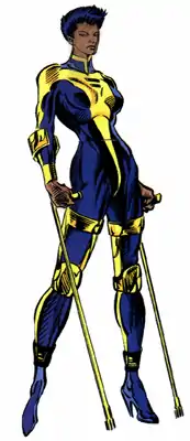 After she became disabled due to injuries inflicted by gunfire, Night Thrasher designed and built a special pair of combat-capable crutches and leg braces for her. Night Thrasher designed the crutches to include both a hidden electric taser that can emit electrical charges to stun an adversary, and a slim anesthetic needle injector that delivered paralytic chemicals. The crutches are also equipped with "smoke gas" and metal firing pellets.