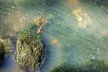 Silt is easily transported in water[44] and is fine enough to be carried long distances by air in the form of dust.[45] While the coarsest silt particles (60 micron) settle out of a meter of still water in just five minutes, the finest silt grains (2 microns) can take several days to settle out of still water.[46] When silt appears as a pollutant in water the phenomenon is known as siltation.[47]