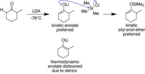 Example synthesis of a kinetic silyl enol ether by reacting an unsymmetrical ketone with trimethylsilyl chloride and LDA at low temperature.
