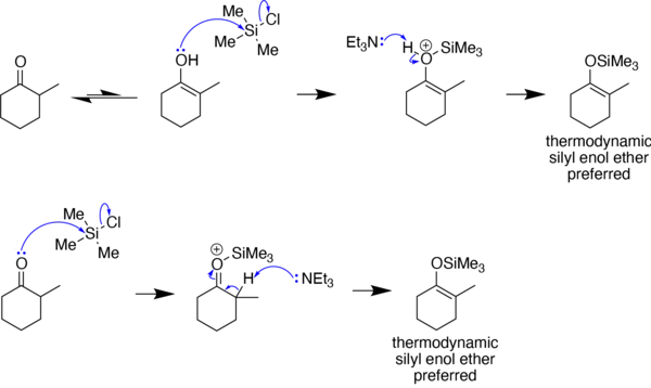 Example synthesis of a thermodynamic silyl enol ether by reacting an unsymmetrical ketone with trimethylsilyl chloride and triethylamine. Two possible mechanisms are shown.