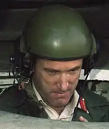Cooper in the driver's compartment of an M1 Abrams tank in 1985