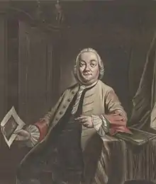 Simon Fokke holding one of his engravings, (by John Greenwood after a portrait by Jacobus Buys)