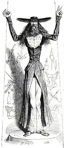 Ganneau, drawn in 1883 (after his death) by contemporary cartoonist Charles-Joseph Traviès de Villers, in front of a poster depicting the five phases of the world he preached would occur.