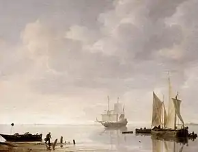 The earliest known works of De Vlieger date from 1624.[2] These marine pieces were still strongly influenced by the work of Jan Porcellis and Willem van de Velde the Elder and shows several ships and rocky coasts.[4][5][6] In the 1630s and 1640s he was one of the best-known Dutch maritime painters. He moved away from the monochrome style of Jan Porcellis and Willem van de Velde the elder towards a more realistic use of colour, with highly detailed and accurate representations of rigging and ship construction. He painted ships in harbour and at sea as well as storms and shipwrecks.