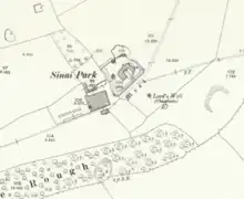 From the late 18th century the estate was rented out to a number of merchants and farmers. By 1796 it had settled on the modern spelling of Sinai Park, apparently coined by William Burton in 1622 as an allusion to the Biblical wilderness which he alleged the estate resembled.[3] In the Georgian era a plunge pool, fed by the chalybeate spring, was installed and said to have healing properties; on later maps it is labelled as the "Lord's Well".[5] The house's porch was refurbished in the 19th century with a new facing, set in from the timbers, and three casement windows installed.[2] The last Paget owner was the eccentric Henry Paget, 5th Marquess of Anglesey, the estate was sold to pay off his debts.[5][4]