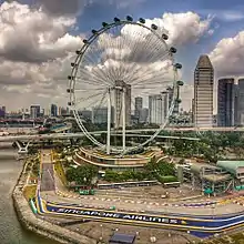 The Singapore Flyer[lower-alpha 1] is an observation wheel at the Downtown Core district of Singapore. Officially opened on 15 April 2008, it has 28 air-conditioned capsules, each able to accommodate 28 passengers, and incorporates a three-story terminal building.[5][6] The flyer has made numerous appearances in media and popular culture that features Singapore.