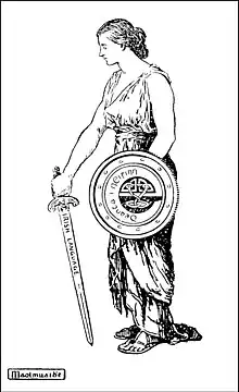 "Irish names were attached to goods that never saw Ireland until they were brought into the country ready for sale. The Sinn Feiners discovered the fraud, and countered by the establishment of the Irish trademark. A sign peculiar to Ireland was agreed upon, namely a scroll device representing the legendary Collar of Malachi, surrounded by the words, Deantha i nEirinn [sic.] (Made in Ireland). The use of this sign was permitted to manufacturers who could show that their goods were made in the country, and every infringement was prosecuted under the British Trades Mark Law, the Irish people being for once able to use British law to their own advantage."[3]