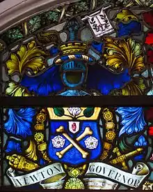Coat of arms of Sir Alfred James Newton as Governor of the Irish Society in a memorial window of the Irish Society, erected at its tercentenary 1613–1913 in the town hall of Coleraine.[11] Blazon: Azure, two shin-bones in saltire, the sinister surmounted of the dexter or, between as many roses in fesse argent, barbed and seeded proper, on a chief of the second a lotus-flower leaved and slipped of the last.[12]