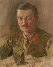 Wake transferred to the staff of I Corps in 1915 and became a 2nd grade general staff officer on 1 February 1916, returning to the War Office.[13][17] Wake was appointed 1st grade staff officer on 1 March 1916 on the staff of the 61st Infantry Division and also received the temporary rank of lieutenant colonel.[18][13] Wake was promoted to the temporary rank of brigadier-general in 1917.[14] Wilson was then the British military representative on the Allied Supreme War Council (SWC), based at Versailles, and selected Wake to join the organisation's secretariat in December.[19][20] Wake headed the British E Branch, responsible for estimating the state of enemy manpower and materiel, the first time that such an in-depth study was attempted by the British.[8][21] In this role he noted the difficulties the Allies had in estimating the strength of Austro-Hungarian forces on the Italian front.[22] Wake's men were encouraged to think like their opponents and Wilson had them wear their caps back to front to remind them of this.[21]