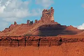 Sister Superior is a 6,037 ft elevation sandstone summit located southeast of The Convent in Grand County of Utah, United States. Sister Superior is located between Professor Valley and Castle Valley, near the city of Moab. It is situated east of Parriott Mesa and southwest of the Fisher Towers area. Remnants of an eroded butte,[3] Sister Superior is a thin tower with 300+ ft vertical Wingate Sandstone walls standing on a 1,000 foot Moenkopi-Chinle base. The nearest higher peak is The Rectory (6,565 ft), 1.2 miles (1.9 km) to the south. Further south along the connecting ridge is Castleton Tower. Precipitation runoff from Sister Superior drains into the nearby Colorado River. The first ascent was made May 17, 1965, by Harvey Carter and David Bentley.[4]