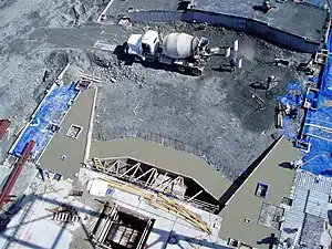 View from steel girders down onto stage wings and audience chamber of the auditorium under construction (11 May 2006)