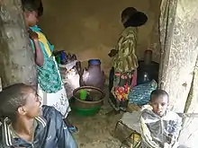 Almost every settlement in Tigray holds one or more Inda Siwa, which serve as local bars and which generate off-farm income.[8] Low seats are foreseen around the walls of the room; people drink in group and chat while sipping their siwa. Commonly after some drinks, tongues get loose. If a newcomer joins the group of customers, all will politely welcome him and invite him to sit with them. The owner of the business, mostly a woman, tallies the number of consumptions per customer and may get help from the customers to do her accounting. Frequently, adolescent boys or girls drop in to sell kollo (roasted grains) or buqulti (germinated beans)[9] seasoned with senafiche (home-made mustard). The consumption of these snacks will stimulate the customer to order additional siwa. Smaller inda siwa open only on fixed days of the week, but in any case, all inda siwa will be open on (the eve of) market days.