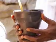 In almost every rural household of Tigray, the woman knows how to prepare the local beer, siwa in Tigrinya language. Basic ingredients are water, a home-baked and toasted flatbread commonly made from barley in the highlands,[1][2][3] and from sorghum, finger millet or maize in the lowlands,[4] some yeast (Saccharomyces cerevisiae),[5] and dried leaves of gesho (Rhamnus prinoides) that serve as a catalyser.[6] The brew is allowed to ferment for a few days, after which it is served, sometimes with the pieces of bread floating on it (the customer will gently blow them to one side of the beaker). The alcoholic content is 2% to 5%.[7][5] Siwa has a smoky flavour (originating from the toasted bread) and a typical sourness, bitterness, and sweetness (pH between 4 and 5).[5] Most of the coarser part of the brew, the atella, remains back and is used as cattle feed.