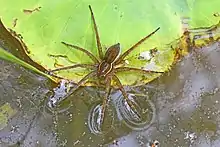 Prey detection is thought to arise through two different strategies - the use of tactile stimuli on the water surface and via eyesight. For the former strategy, the anterior two pairs of legs rest on the water surface and respond to the stimuli of ripples along the water surface. They are often seen with their legs sprawled out by the water while they are waiting for prey. They hunt by the water's surface in which they can walk on water and dive under up to 18 cm (7.1 in) to capture prey. Their good vision contributes to their success when diving to capture prey.[7] They capture underwater prey as well as prey that fall on the water's surface or travels on water, such as water striders. Visual stimuli, while used, are less important.[5]
