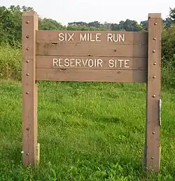 The Six Mile Run Reservoir Site, part of the Delaware and Raritan Canal State Park, is located in Franklin Township, Somerset County, New Jersey, United States. It is adjacent to the Delaware and Raritan Canal. It covers 3,037 acres (12.29 km2). The reservoir plan was to flood the Six Mile Run watershed. The Six Mile Run is a tributary of the Millstone River that, with its tributaries (Cross Brook, Middlebush Brook, Nine Mile Run and Steep Hill Brook and several other unnamed ones), drains a large area in central Franklin Township, Somerset County, New Jersey and western portions of North Brunswick and South Brunswick Townships in Middlesex County, New Jersey.[1] It derives its name, along with other streams (Mile Run, Three Mile Run, Nine Mile Run, and Ten Mile Run), from the distance early surveyors estimated it was from the point where the historic King's Highway (now Rt. 27) left the Raritan River at New Brunswick to the point the roadway crossed the stream. The estimates were not very accurate but the stream names have remained in use ever since.
