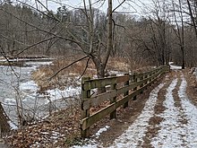 Like many creeks draining into Lake Ontario, Sixteen Mile Creek has cut a deep valley that is home to a broad range of wildlife, including whitetail deer, raccoons, foxes, opossum, and squirrels.[6] The forest contains tree species typical of the Carolinian forest habitat,[7] although since this is close to the northern limit of this zone, some are poorly represented. The total area of the drainage basin is 372 square kilometres (144 sq mi).[8]