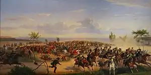 The advancing Danish cavalry reached a hill west of Riis Skov when two German squadrons counter-attacked from the south and from Hasle in the west, resulting in a hectic cavalry skirmish. Elements of the Danish force were sent back to Vejlby to take up defensive positions which was misinterpreted as a general retreat and the Prussian infantry advanced north-west, bypassing the Danish forces at Riis Forest. At this time Danish reinforcements arrived from the north and the German forces now found themselves both outnumbered and surrounded, forcing a retreat back to occupied Aarhus.[1][2]